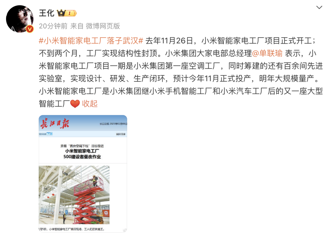 同时,王化还转发了长江日报“奔着‘首台空调下线’目标奋进,小米智能家电工厂500建设者昼夜作业”的报道。