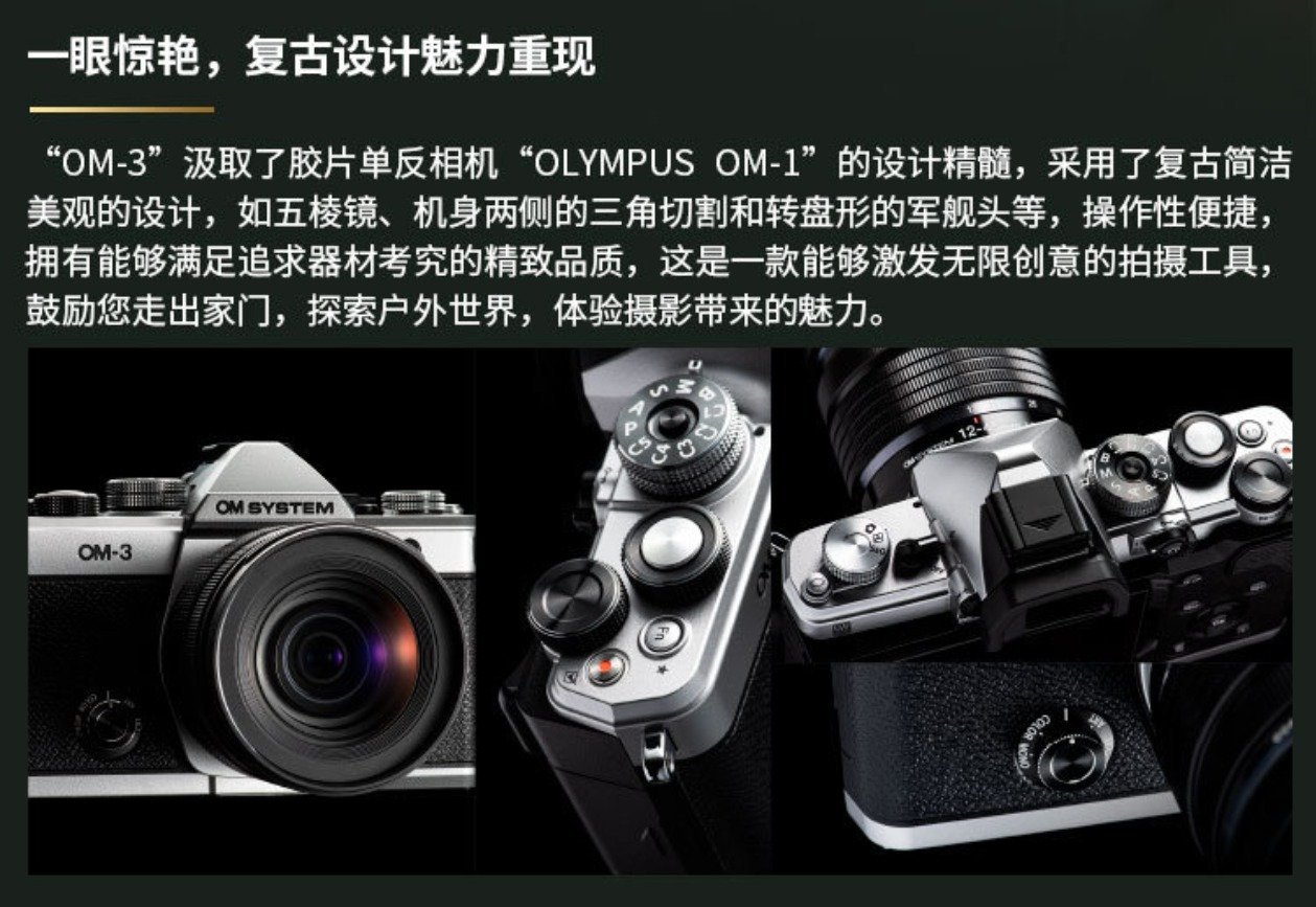 OM-3 从胶片单反相机 OLYMPUS OM-1 上汲取了设计元素,颇具复古元素,机身两侧采用了三角切割,还有转盘形的军舰头,并且还有五棱镜设计,兼顾了复古风味和实用性。