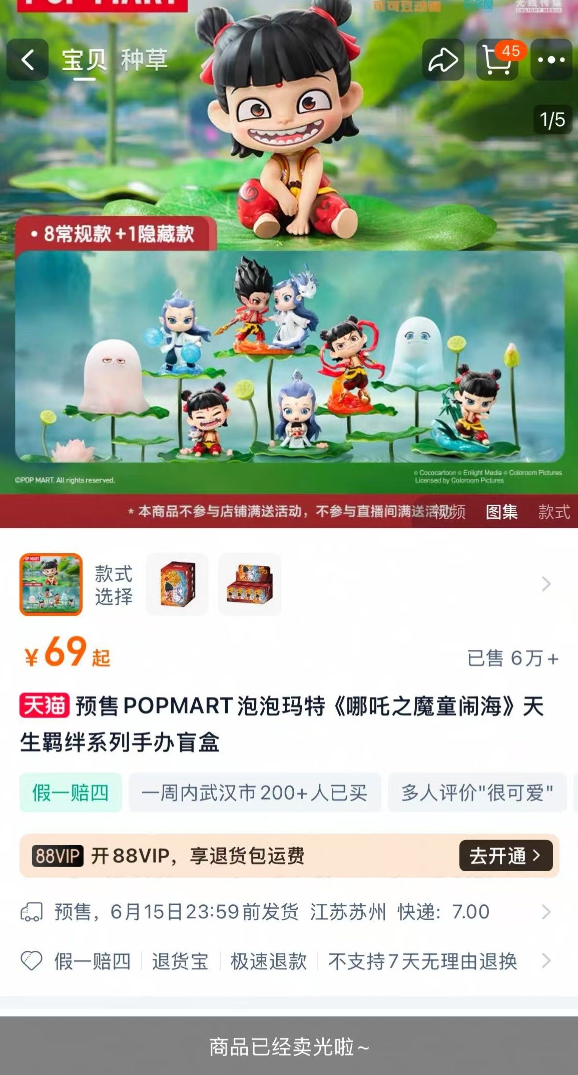 公开资料显示,泡泡玛特《哪吒之魔童闹海》天生羁绊系列盲盒于今年1月30日晚上10点在线上发售,次日线下发售,单个盲盒发售价为69元。在某平台泡泡玛特旗舰店该款产品已下架,客服回复称“目前已售完无货,暂未收到后续补货消息”。