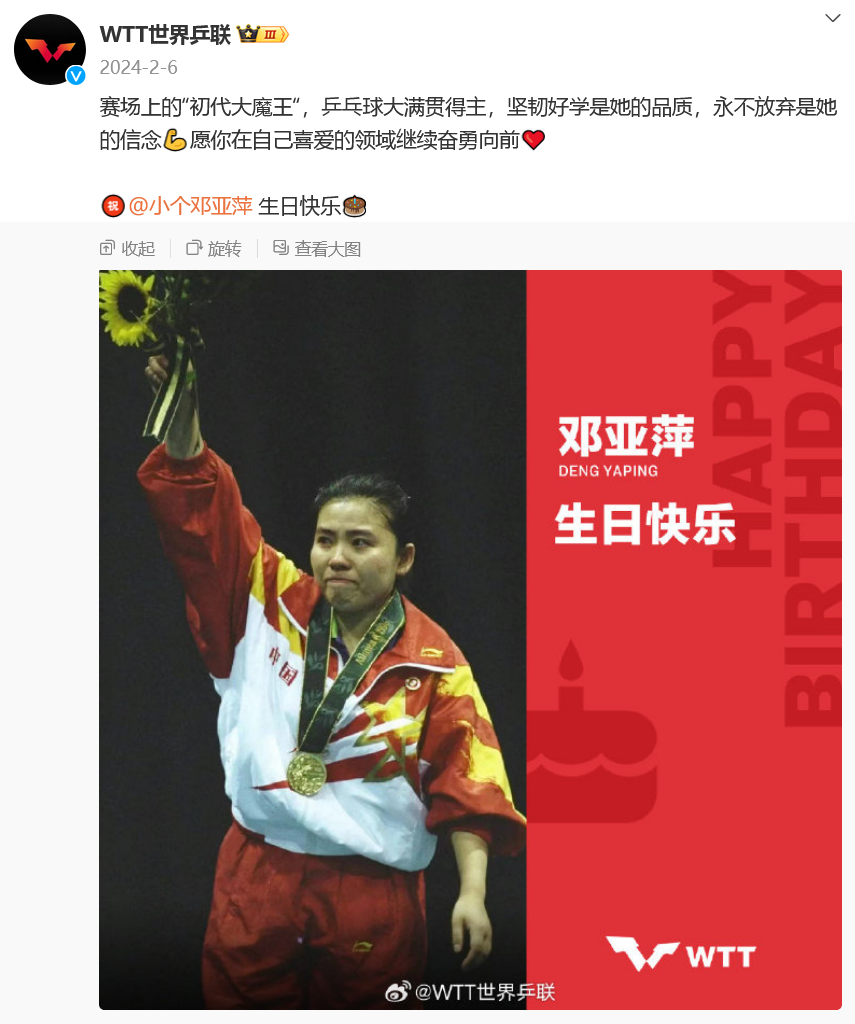 据悉,2024年2月6日,WTT世界乒联也曾发文为邓亚萍送上生日祝福:“赛场上的‘初代大魔王’,乒乓球大满贯得主,坚韧好学是她的品质,永不放弃是她的信念。愿你在自己喜爱的领域继续奋勇向前,祝邓亚萍生日快乐。”