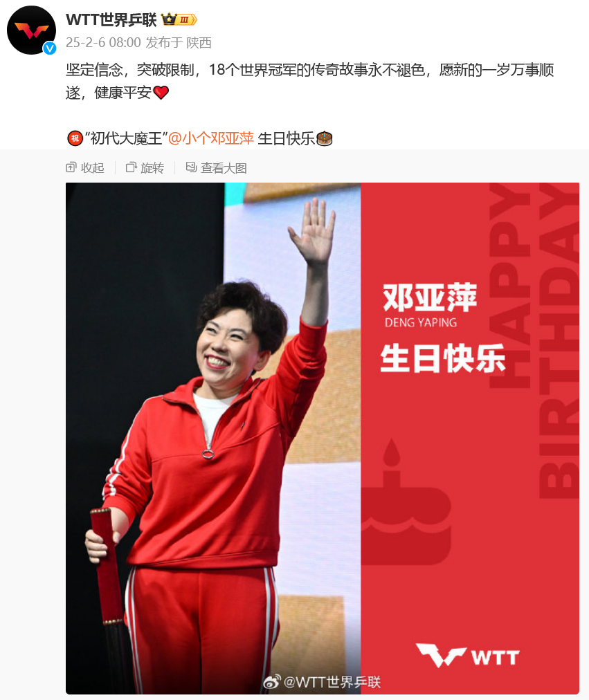 2月6日,邓亚萍迎来52岁生日,WTT世界乒联发文送上祝福。