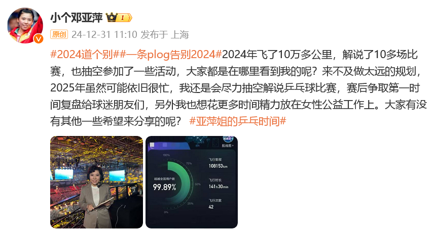 此前,邓亚萍曾公布2025年的新年计划:“2025年虽然可能依旧很忙,我还是会尽力抽空解说乒乓球比赛,赛后争取第一时间复盘给球迷朋友们,另外我也想花更多时间精力放在女性公益工作上。”