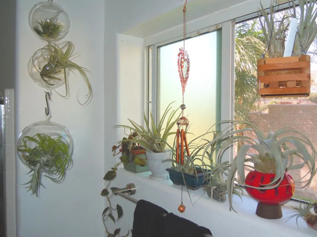 空气凤梨不需要用盆土或水培栽种,可以悬挂在卫生间里的,摆放位置最好是有一点点散光,加上环境温暖和高湿度的环境,这些空气凤梨会长得特别好。