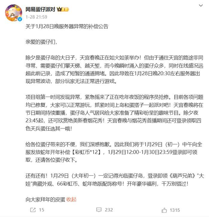 很好笑的是,以上这三个成功案例,都在除夕至少出现过一次网络问题:《王者荣耀》在除夕当天零点、也就是新皮肤集中上线的节点开始,经历了一段时间的充值异常;《和平精英》也在约1小时后紧跟着出现了充值异常。
