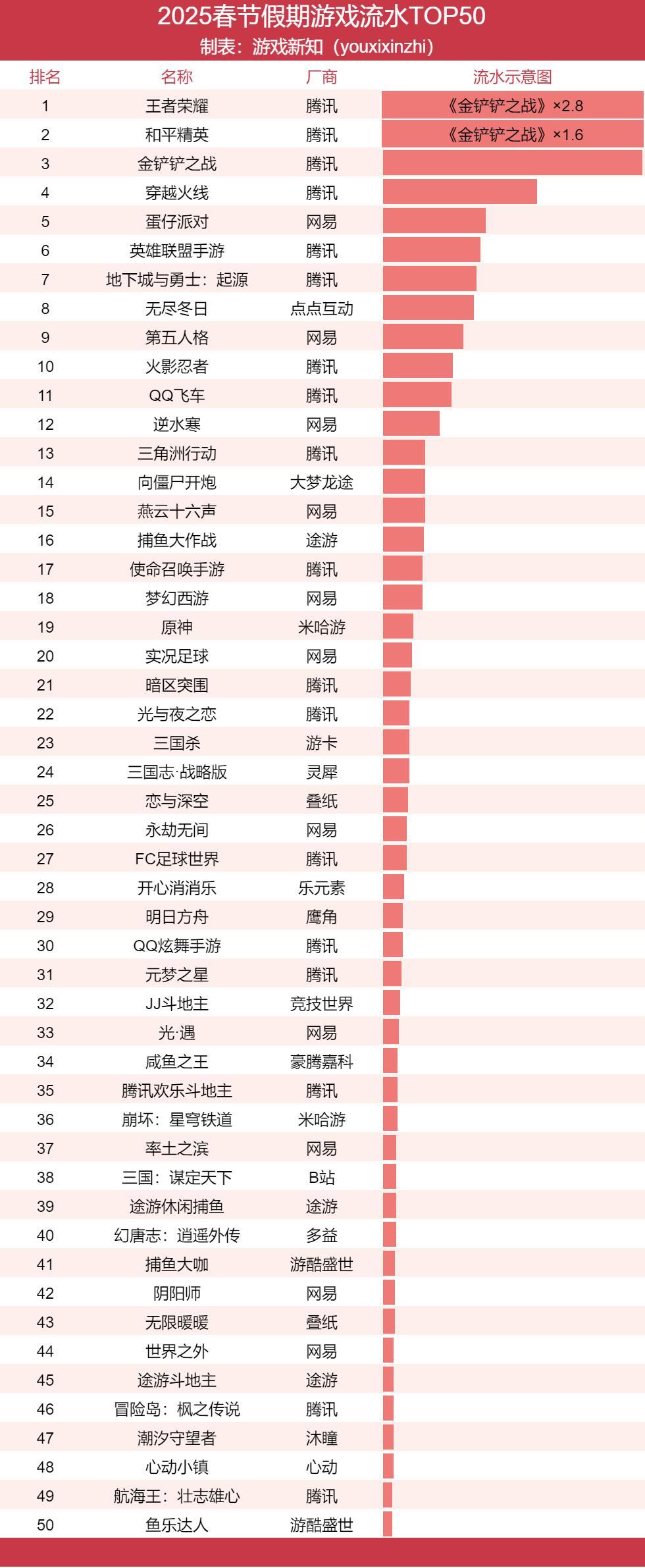 春节假期中的最大赢家无疑是腾讯网易。在春节假期收入榜单TOP100当中,腾讯有30款游戏,网易则有19款,两家公司占去了将近一半的份额。