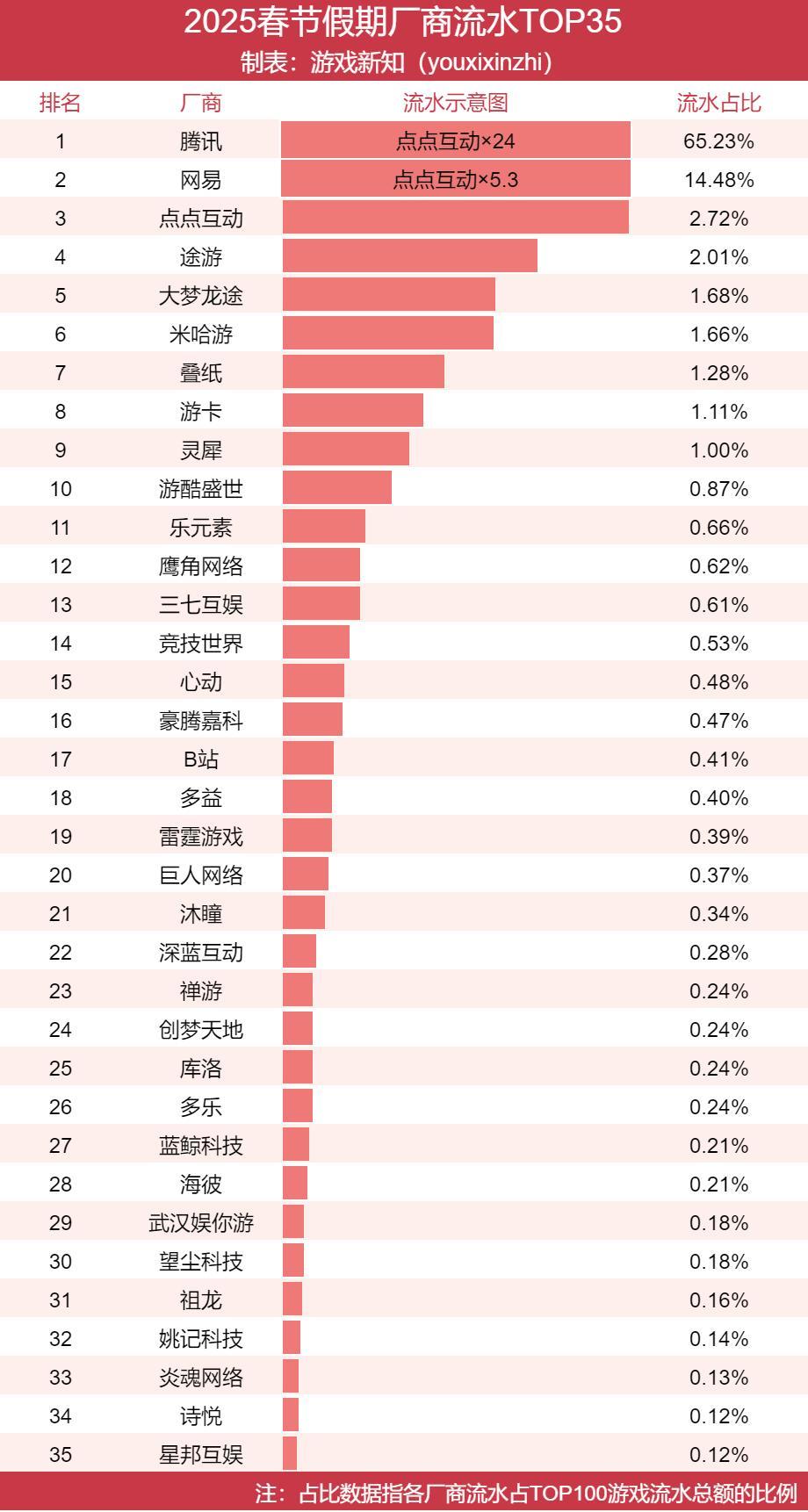 Sensor Tower数据显示,春节假期手游收入排名TOP100来自于35家厂商。这份名单当中还是老面孔居多。
