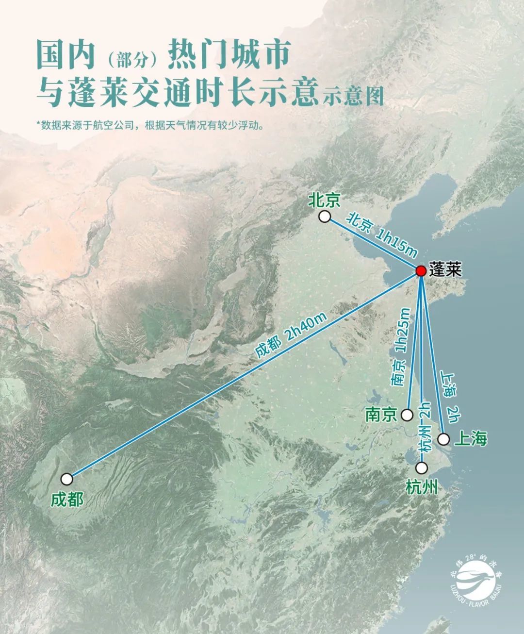 茅玉峰从宁波出发,只需要飞两小时就可以落地蓬莱机场。国内的一些其他热门城市,如北京、上海、杭州,飞到蓬莱也只需要一到两小时。
