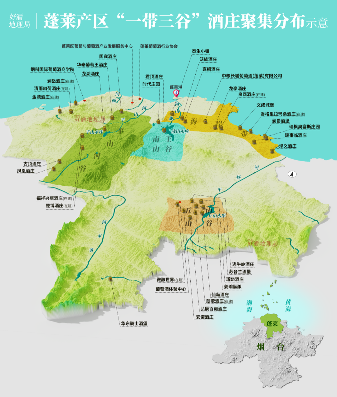 此外,还有数十个各具特色的酒庄,均匀地分布在“一带三谷”(沿蓬莱海岸带和南王山谷、丘山山谷、平山河谷)之上,一同缔造了蓬莱海岸产区。