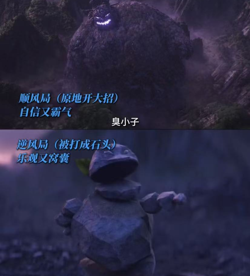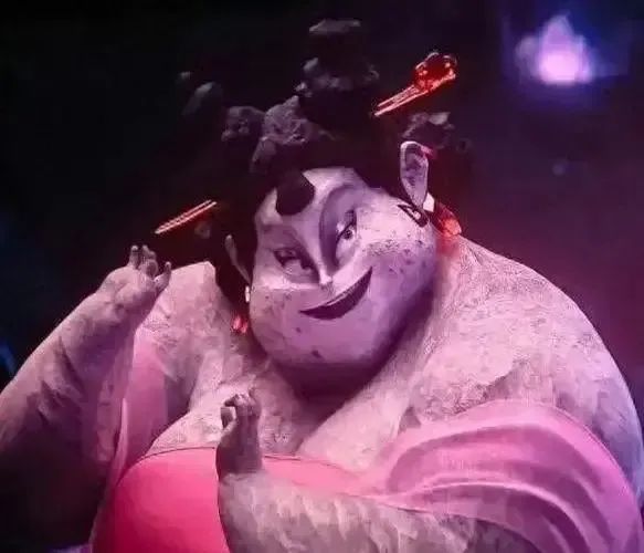 再具体到影片中,粉红披肩、双丫髻的少女感妆造与巍峨体型结合,石矶娘娘以大胖丫头的形象闯进观众视野。这一闯不要紧,随后的mini版石矶娘娘带着儿童声线与小石子造型放狠话,又让观众开眼。