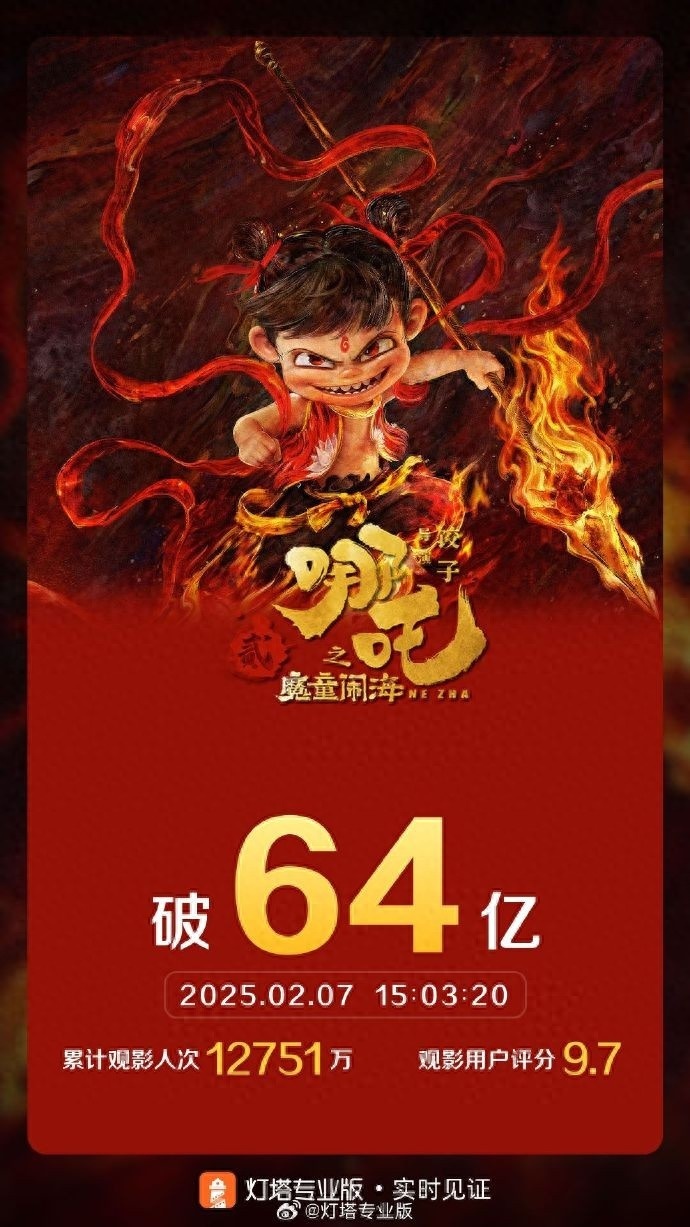 据灯塔专业版实时数据,截至2月7日15时3分,影片《哪吒之魔童闹海》票房突破64亿。