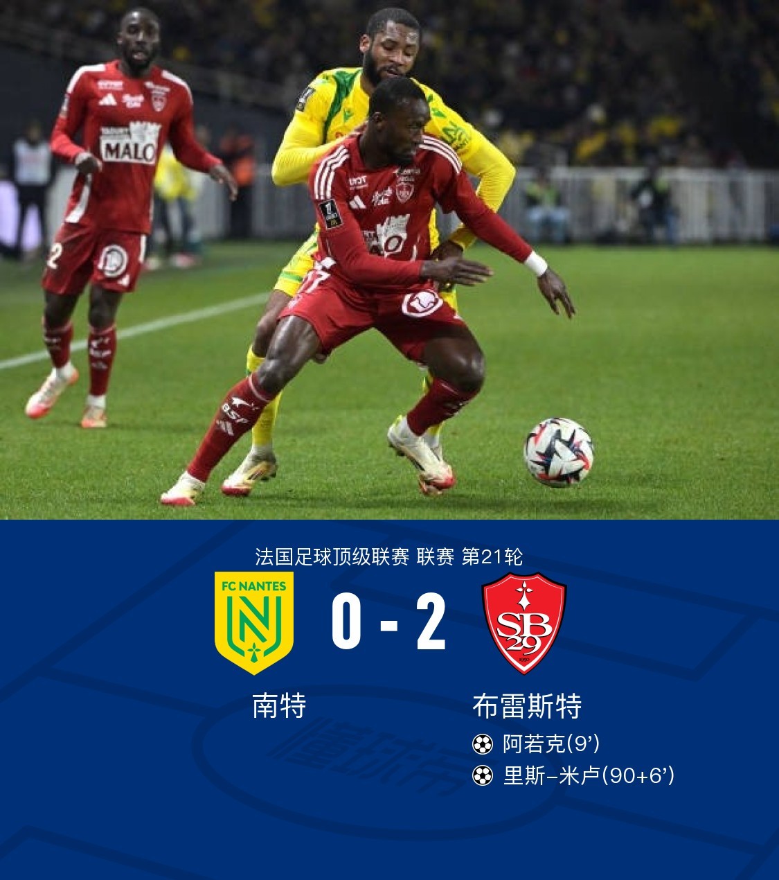 在法国足球顶级联赛第21轮的比赛中,南特坐镇主场迎战布雷斯特。比赛中,布雷斯特的阿若克在里斯-米卢的助攻下成功破门,为球队首开纪录。随后,里斯-米卢再度展现出色表现,亲自攻入一球,帮助布雷斯特扩大领先优势。最终,布雷斯特以2比0战胜南特,取得了本场比赛的胜利。