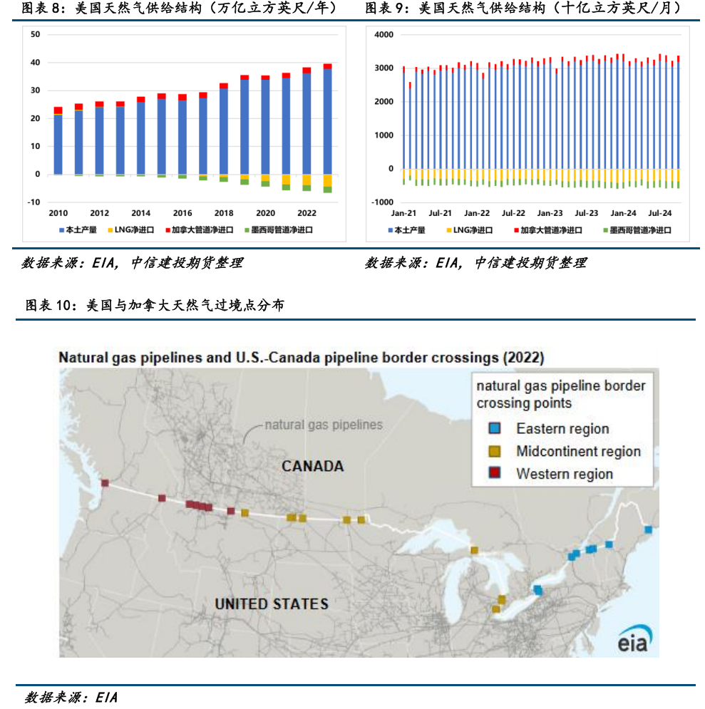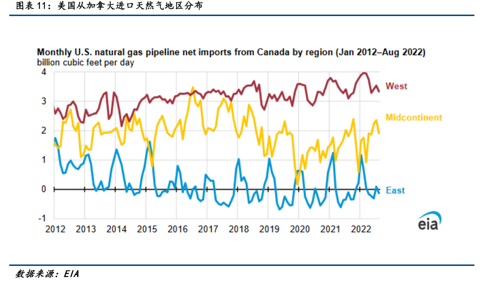 美国天然气市场体量庞大,加拿大对美国的净出口占美国总供给的6%。从库存影响角度观察,美国每年峰值天然气库存不到4万亿立方英尺,而从加拿大每年进口量2万亿立方英尺左右,来自加拿大的供给量虽然不大,但如果进口量有损失,对于美国天然气市场仍可产生重大影响。结构上来看,由于WCSB位于西部,而美国北方主产区阿巴拉契亚地区位于东部,因此美国主要从美加边境的中西部进口天然气,供给太平洋沿岸和芝加哥一带,东部则从阿巴拉契亚地区向人口较密集的加拿大东部净出口。