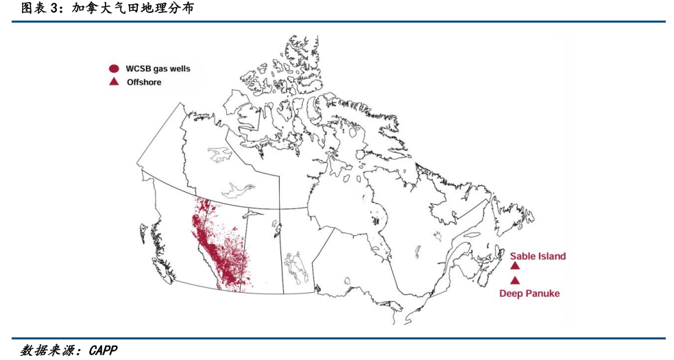 加拿大主要的天然气产量由Alberta(阿尔伯塔)省和BC(不列颠哥伦比亚)省的WCSB(西加拿大沉积盆地)贡献。美国页岩革命开始后,受美国页岩气增产的冲击,WCSB的常规气产量开始下滑,不过随后WCSB也发现了页岩气储量,页岩气开发重新推动加拿大天然气产量增长。WCSB东南为常规气主产区,位于Alberta省内,西北为页岩气主产区,跨越Alberta和BC省。因此上述生产结构的转变体现为下图BC省产量占比的提升。总的来讲,加拿大天然气产量前景主要取决于WCSB西北页岩气的开发进程。