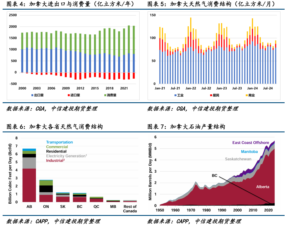 分部门来看,加拿大本国消费集中于工业。分地区来看,Alberta占总消费量的近半数,且同样集中于工业部门,占加拿大人口40%的ON(安大略)省消费显然更为常规地主要分布于居民和商业部门,但总量反而有限。主要原因在于,Alberta省的工业消费主要应用于油砂开采。Alberta省东北部的油砂贡献了加拿大大部分原油产量,油砂在自然状态下为固体,需要向油砂储层中注入高温蒸汽,才能使其转变为方便抽取的状态,蒸汽生产则依赖天然气作为热源。总的来说,近年来加拿大天然气消费量增长背后的核心原因,其实是Alberta省油砂产量的持续提升。