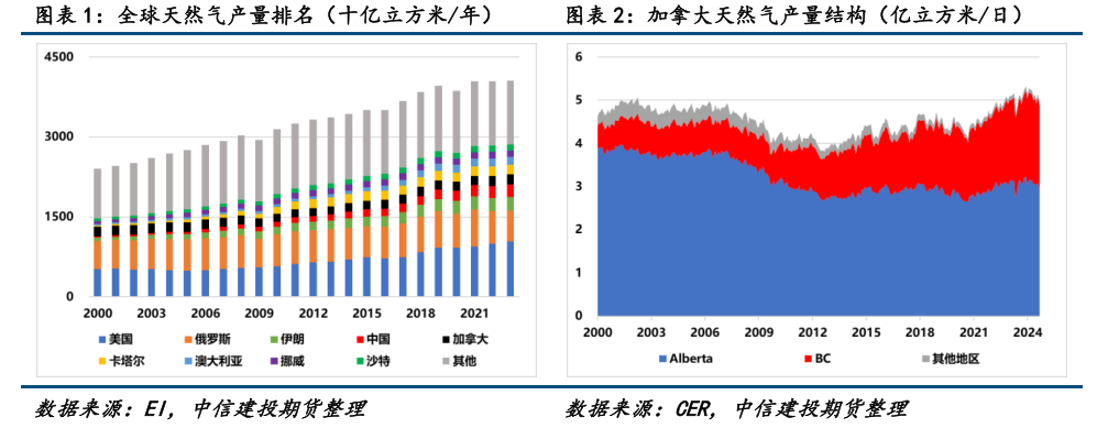 2025年中,加拿大1400万吨/年的LNG出口码头项目LNG Canada即将投产,这是加拿大第一个LNG项目,也是2025年有望达产最大型的LNG项目。加拿大将由此步入LNG出口国行列,不过其国内的天然气供需格局此前并不为市场所熟知。我们将在本篇文章中从加拿大天然气资源情况、天然气需求分布、美加天然气贸易等环节入手解析加拿大天然气供需格局,填补以往研究盲区,从而更全面地理解项目投产对于加拿大国内与全球市场的影响。加拿大是全球第五大天然气生产国,2023年产量1900亿立方米,占全球总产量的5%。