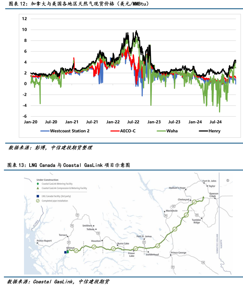 综上所述,我们认为一方面,2025年中LNG Canada投产带来天然气需求的提升将使得加拿大天然气供需缺口骤然放大,而供给端或难以做出迅速反馈,供需硬缺口的存在将支撑Westcoast Station 2、AECO-C等地区价格偏强运行,并可能由相对Henry Hub贴水转变为升水,美国天然气价格将同样受到向上助力。另一方面,加拿大国内天然气供需的阶段性偏紧或对LNG Canada投产进程形成制约,若投产因原料供应问题受阻,全球LNG供需格局将较此前预期大幅转紧,从而引发市场的大幅波动。