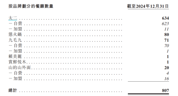 太二也在主动求变。2024年2月,九毛九宣布将开放太二及新品牌山的山外面酸汤火锅加盟。但太二加盟店对加盟商的要求较高,门店需要在大型商业中心区域内,门店面积在180-250平方米,收费项目包含单店25万的加盟费、10万保证金、25万的新店服务支持费以及5%或以下的运营管理费。截至2024年末,太二加盟店合计11家,拓店速度不及山的山外面的16家加盟店。