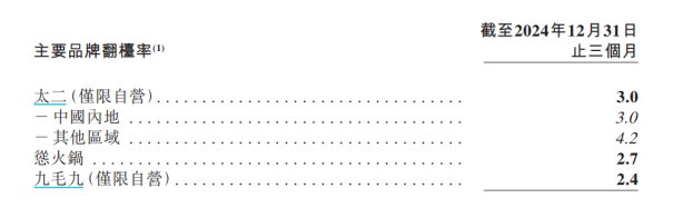 营运数据更直观反映出太二近年的经营现状。2024年第四季度,太二自营店在中国内地的翻台率从三季度的3.6下滑至3.0。价格方面,太二也在通过降价策略尝试挽回顾客,比如2023年,太二自营店在中国内地的人均消费为72元,上年同期则为75元,九毛九解释称,主要由于公司调整菜单供应和食品价格。