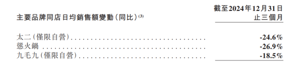 值得注意的是,太二降低平均销售价格并不能有效刺激客流量和翻台率,公司也于2024年下半年逐渐退出了餐饮行业激烈的价格战。招商证券在2024年10月发布的研报中指出,太二的平均销售价格在(2024年)七月、八月、九月每月上涨了人民币1-2元。数据显示,2024年第三和第四季度,太二自营店在中国内地的人均消费分别为:69元和72元,各期对应的同店日均销售额分别同比下滑:18.3%和24.6%。