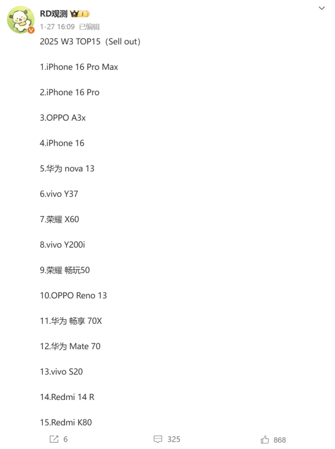 2025 年 1 月已然落下帷幕,叠加元旦、新春佳节和国家补贴,1月份的手机销量 势必是所有人关注的重点,毕竟一款手机的销量好也会直接影响到非常多在观望同学的选购意向。