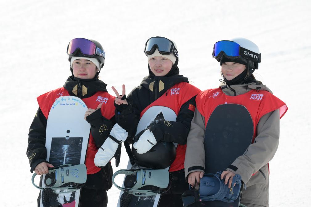 2月8日,张小楠(中)、熊诗芮(左)和铜牌得主日本选手石井斐球在比赛后合影。新华社记者 杨冠宇 摄