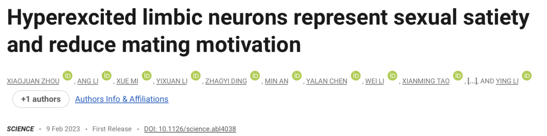Zhou X, Li A, Mi X, Li Y, Ding Z, An M, Chen Y, Li W, Tao X, Chen X, Li Y. Hyperexcited limbic neurons represent sexual satiety and reduce mating motivation. Science. 2023 Feb 9:eabl4038. doi: 10.1126/science.abl4038. Epub ahead of print. PMID: 36758107.