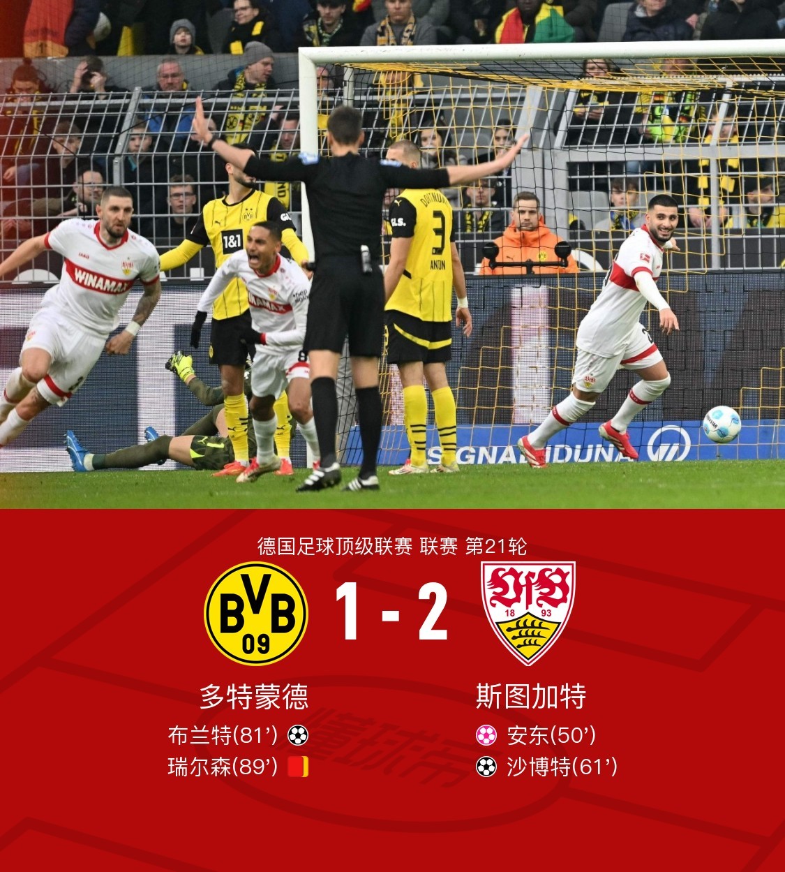 第62分钟,莱韦林斜传,沙博特门前垫射破门,多特0-2斯图加特