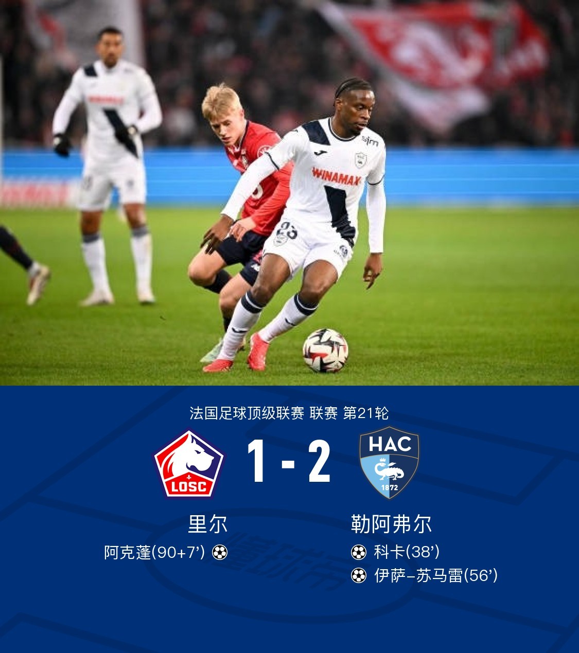 在法国足球顶级联赛第21轮的较量中,里尔坐镇主场迎战勒阿弗尔。比赛中,勒阿弗尔的科卡在伊萨-苏马雷的助攻下率先破门,随后伊萨-苏马雷再度建功,为勒阿弗尔扩大领先优势。比赛接近尾声时,里尔的阿克蓬打入一球,为主队扳回一城。最终,勒阿弗尔以2比1战胜里尔,客场全取三分。