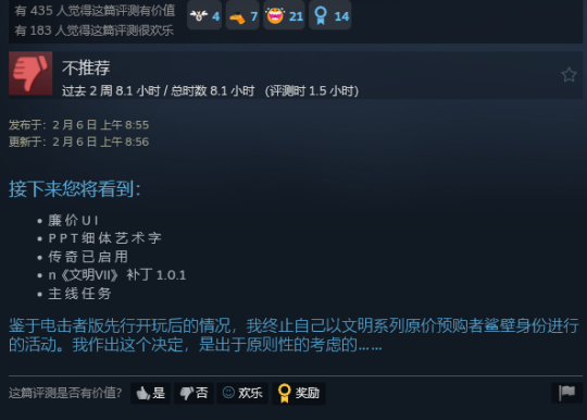 当然,游戏本身的玩法,以及游戏存在的大量 BUG 也是玩家的批评重点。许多购买了豪华版的玩家表示自己花更多钱帮忙测试 BUG,不仅会频繁闪退、切回合会卡,而且玩法的巨大改动,特别是时代系统的变化,引发了许多的批评。不过 UI 是许多英文差评中最常见的痛点。