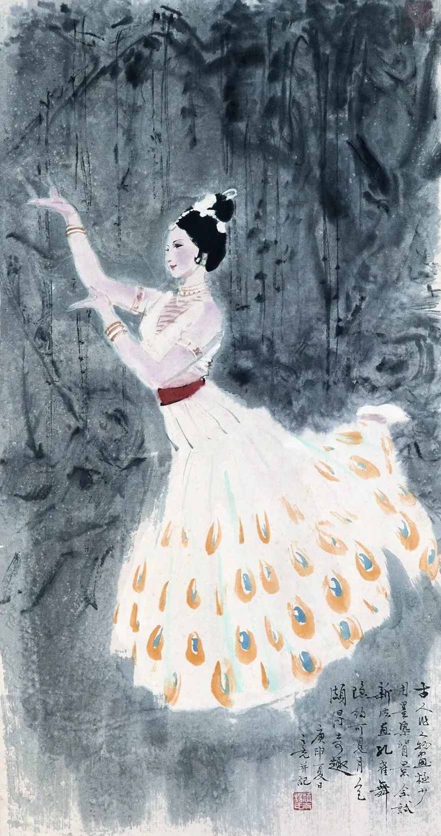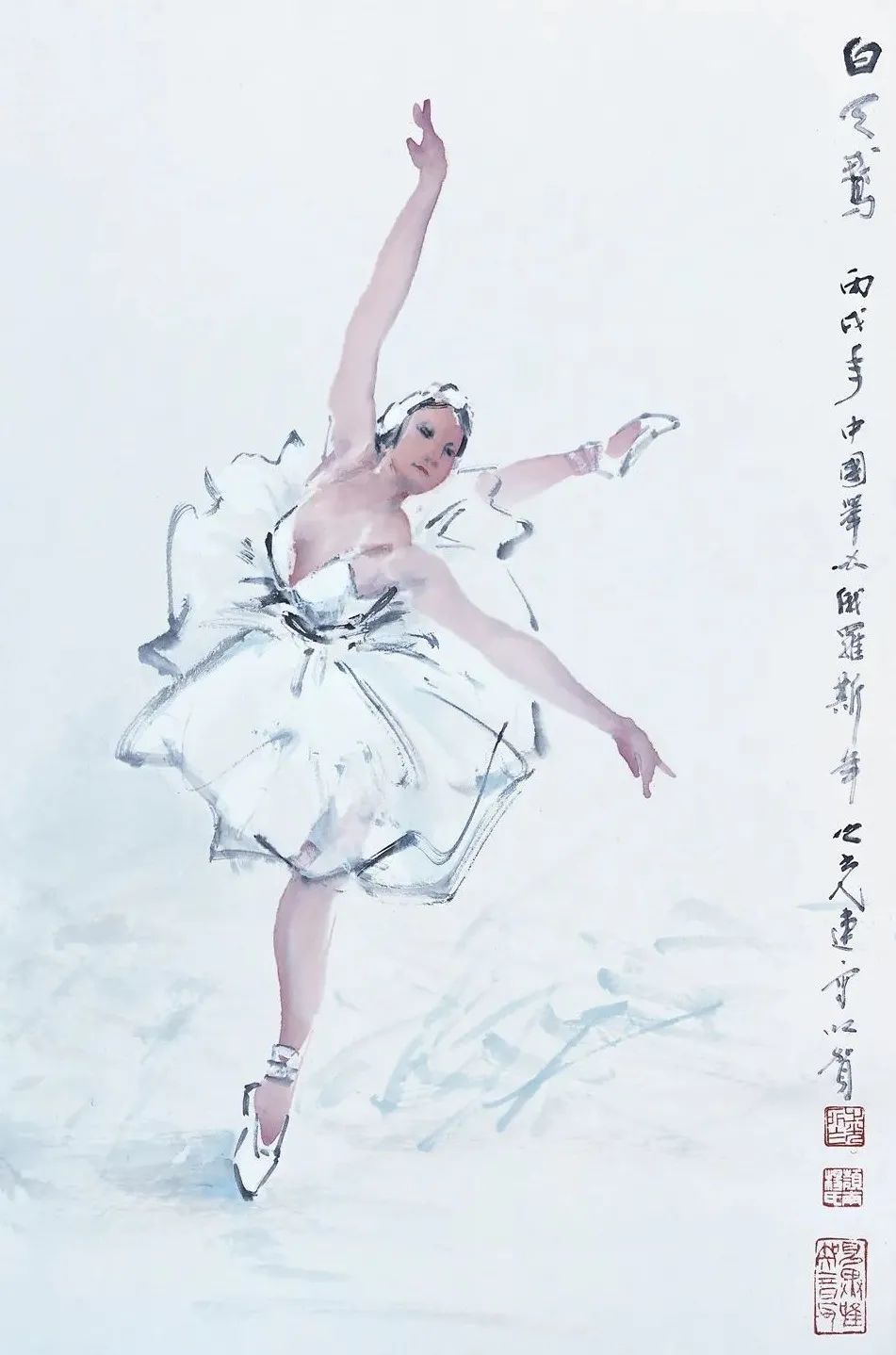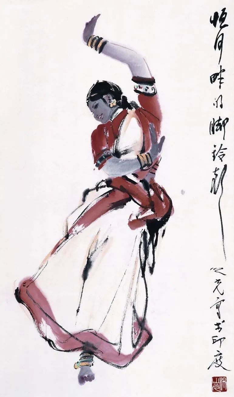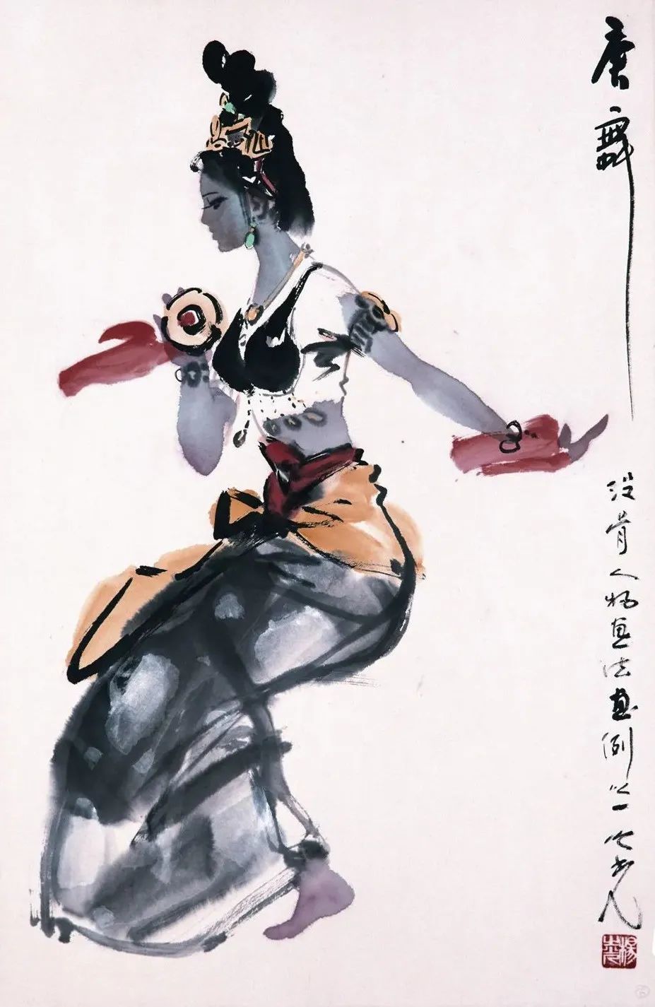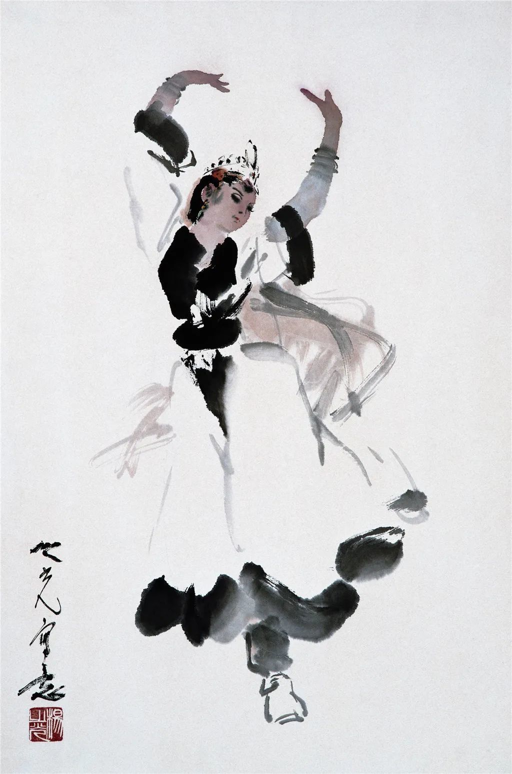 于是,我选定唱到“我不挂帅谁挂帅,我不领兵谁领兵”时穆桂英手托金印这一瞬间的亮相,用迅速而肯定的白描线条记录了下来(因白描的传统形式与古装人物的内容容易协调一致)。想要用描绘的动作体现唱词的内容,如果不熟悉剧情,就是感觉再好的人也是做不到的。又如另一幅日本舞蹈的速写,也有它的特点,日本舞蹈的节奏感特别强烈,动作较为缓慢但明确有力。所以,我用毛笔速写时除了把握舞蹈的动感,还注意运用线条轻重顿挫的变化来表现强烈的节奏感,这后来成为我创作《欢庆驱鬼胜利舞》时笔墨变化的重要依据。