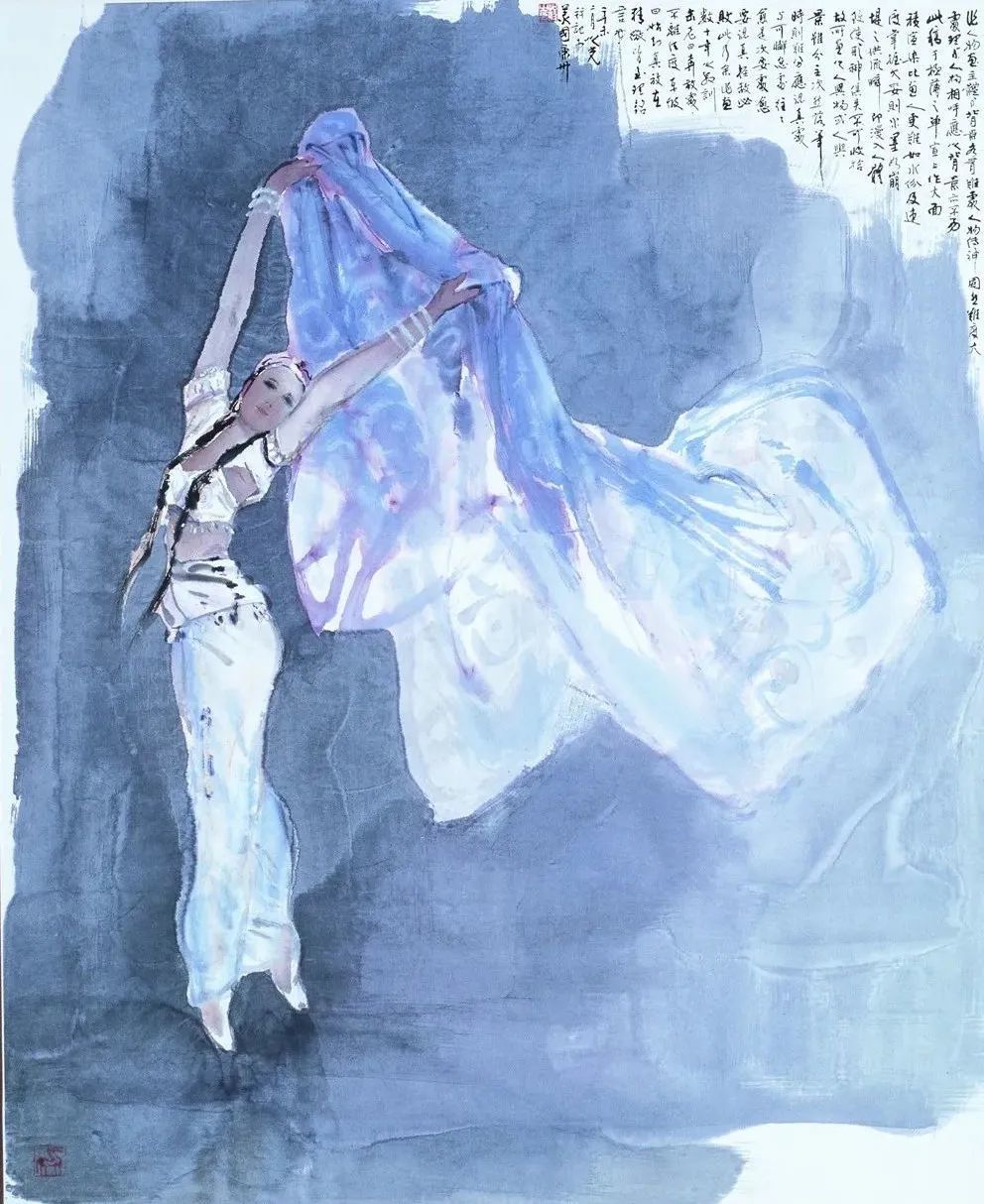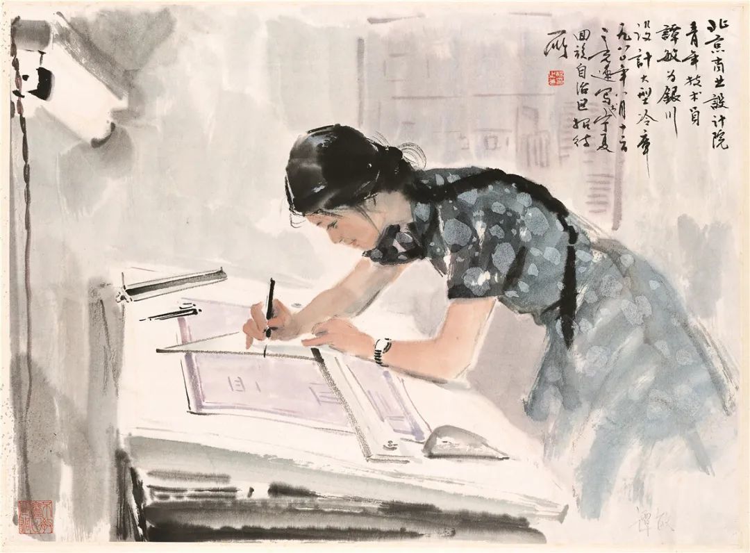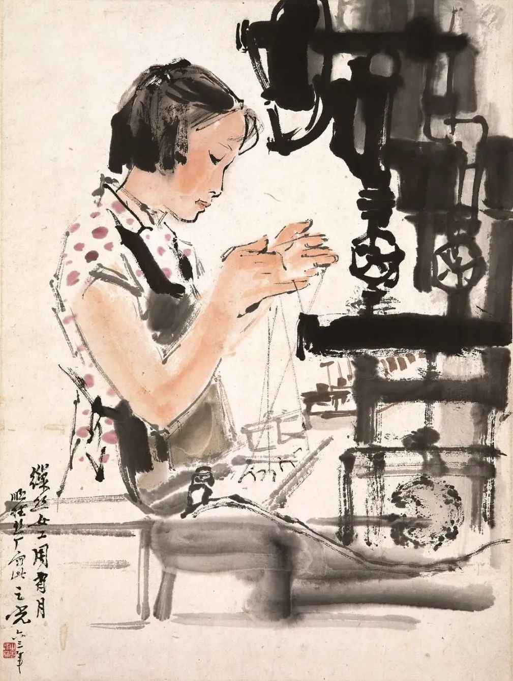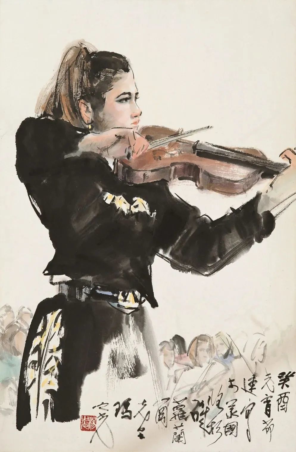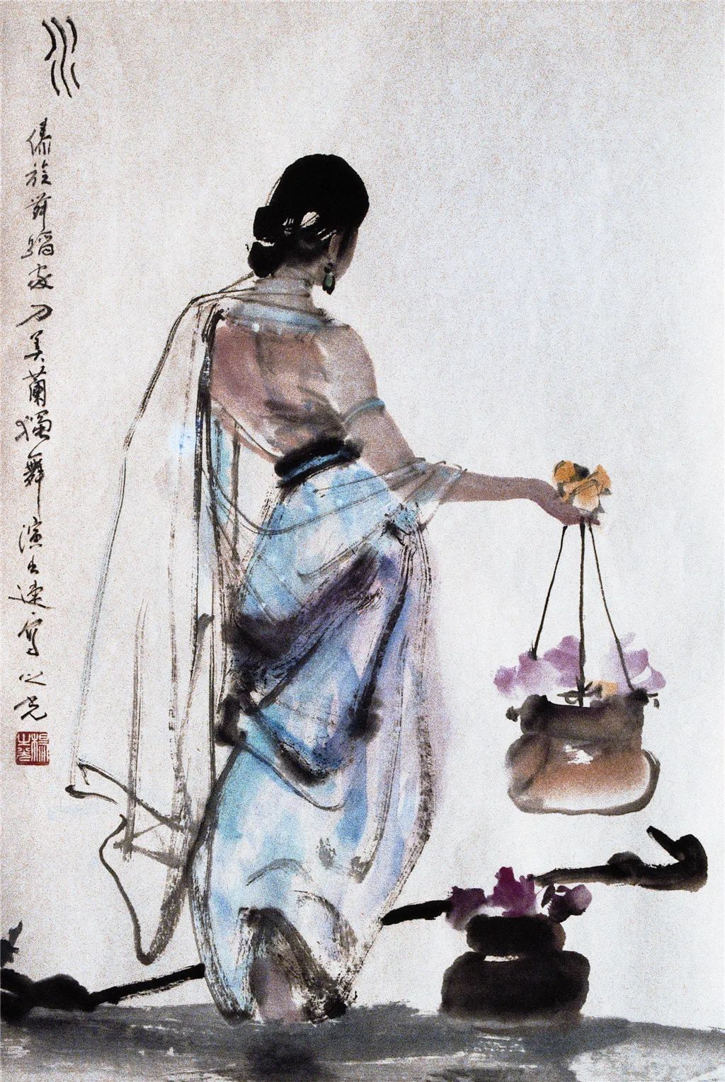 毛笔写生的难处也正是它的好处,我们可以充分利用传统毛笔工具的优越性。一支毛笔千变万化,从毫尖到笔根,从最实的焦墨到虚幻的淡墨,从柔软的质地到坚硬的质地,犹如音乐中从最低音到最高音丰富的节奏感,利用这一切有利因素去传对象的“神”。毛笔写生应该是充满激情的,是有立意、有取舍的,比看到的对象的特点更集中、更强烈。即使是画瞬间即逝的舞台速写,也不例外。困难不全在落笔即成定局的线条不容易追上快速变动的姿态,而往往难在当机立断的刹那间才能表现人物的特点。这个“取”还包括衣纹的处理:舍弃烦琐的,取其最关键的衣纹线条。在这种情况下,就很难说是理解重要还是感觉重要了,只能说是“只有理解了的东西才能更深刻地感觉它”。1962年的八一建军节前后,我曾与京剧团的同志朝夕相处,听多了,看多了,对剧情及表演有了较深入的理解,如此使我很容易找到哪个动作最能体现穆桂英的英雄气概。