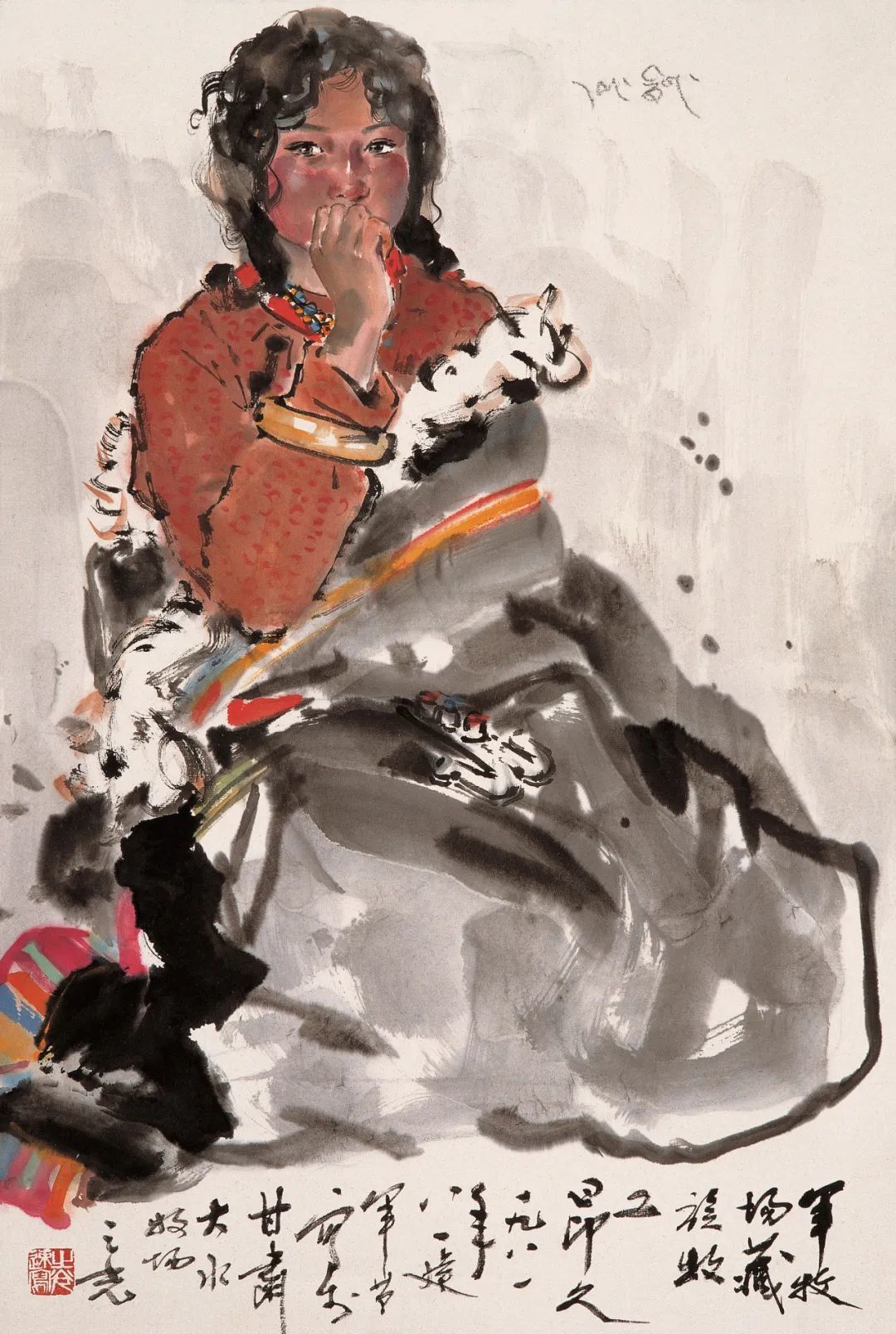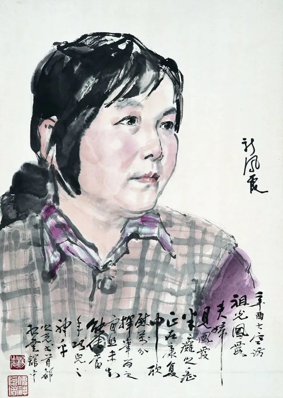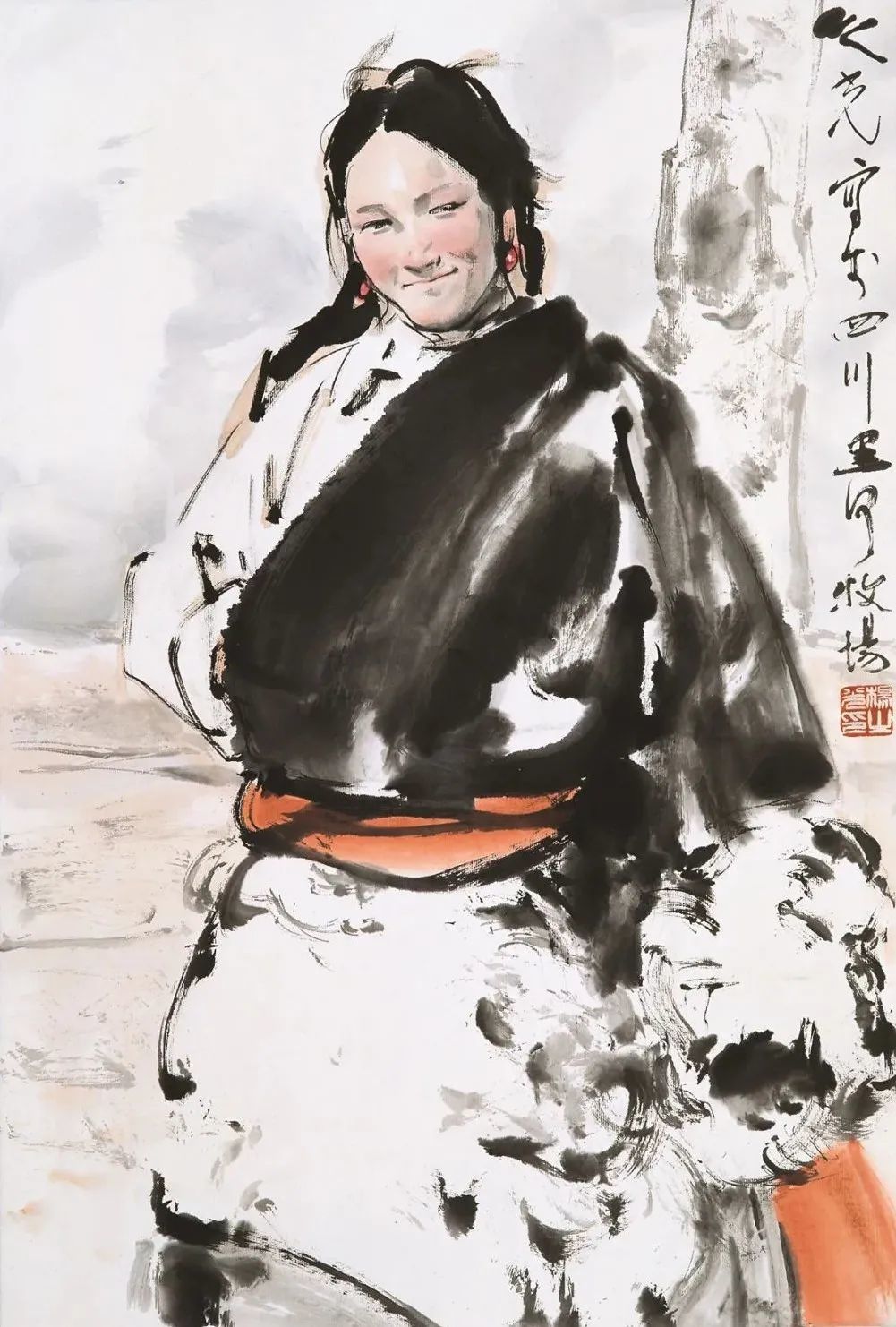 人物写生时为了加强人物的本质,与山水画家写生时重新安排山河一样,人的构图处理也可以运用调度与想象。我在写生《藏族青年阿珍》时,感觉他横坐在长板凳上的动作极似骑在马背上的动作,于是,我将凳子想象成马背,背景的雪山也是虚构的,因为这样可以使人物与环境协调。又如画《公社书记》时,也是在室内写生人物的,景是后来对照秧田补写的,这样通过写生的真实感来加强描绘对象的感染力。由此可见,毛笔写生可以与构图练习结合起来训练,这样的写生就具有创作的因素。从生活到艺术的升华过程,可以从郑板桥谈画竹的经验得到启示。他说,胸中之竹并不是眼中之竹,“意在笔先者,定则也;趣在法外者,化机也”。他很好地说明了眼、心、手三者的辩证关系,与机械地模拟对象的自然主义是格格不入的。