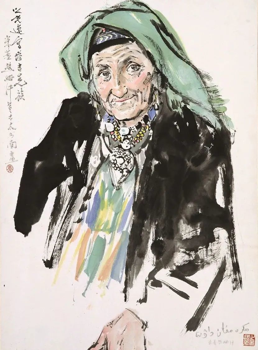 在毛笔写生的过程中,不同的对象必须寻找不同的笔墨去表现。笔墨的精神与对象的传神关系非常密切,如我用结实明朗的笔法去表现阳光下的僾尼民兵,而用另外一种柔和的笔法去表现树荫下温柔的傣族少女(我尝试用先着色后勾线的特殊处理方法来表现自己当时的感受)。当我画“苏大眼”时,完全抛弃了常用的明暗皴擦法,而完全用线条去表现他满脸纹路的特点;画老饲养员郭大伯时,我用明确硬朗的线条去表现他爽朗而又幽默的性格,左边用浓墨画的斜披着的上衣打破了画面的平衡,也加强了其豪放、不拘小节的性格特征。“夫神之所以相异,实有各各不同之处,故用笔亦有各各不同之法”,就是这个道理。
