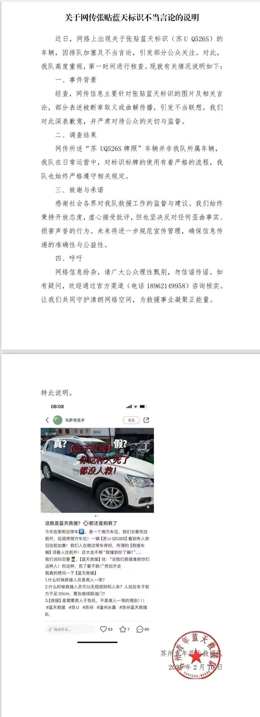 2月10日,“苏州青年蓝天救援队”微信公众号发布“关于网传张贴蓝天标识不当言论的说明”。全文内容如下: