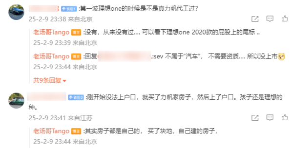 有网友询问:第一波理想ONE的时候,是不是力帆代工过?汤靖回应称:没有,从来没有过,可以看下理想ONE 2020款屁股上的尾标。还有网友拿这件事进行比喻:刚开始没法上户口,就买了力帆家房子,然后上了户口。孩子还是理想的种。汤靖则解释称:其实房子都是自己的,买了块地,自己建的房子。
