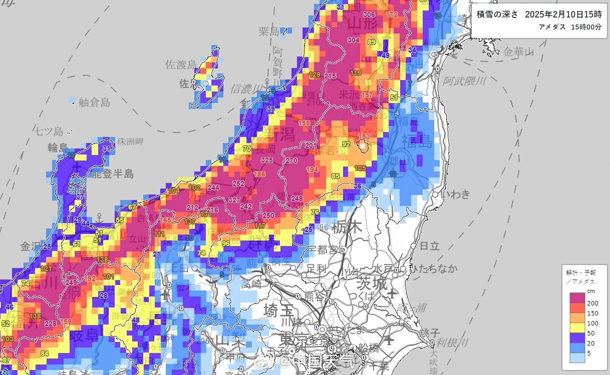 2月10日,据中国天气消息:由于频繁的冷流雪,截至当地时间今天15时,日本本州岛靠近日本海的一侧多地积雪超过了2米,部分地区甚至到达3米。
