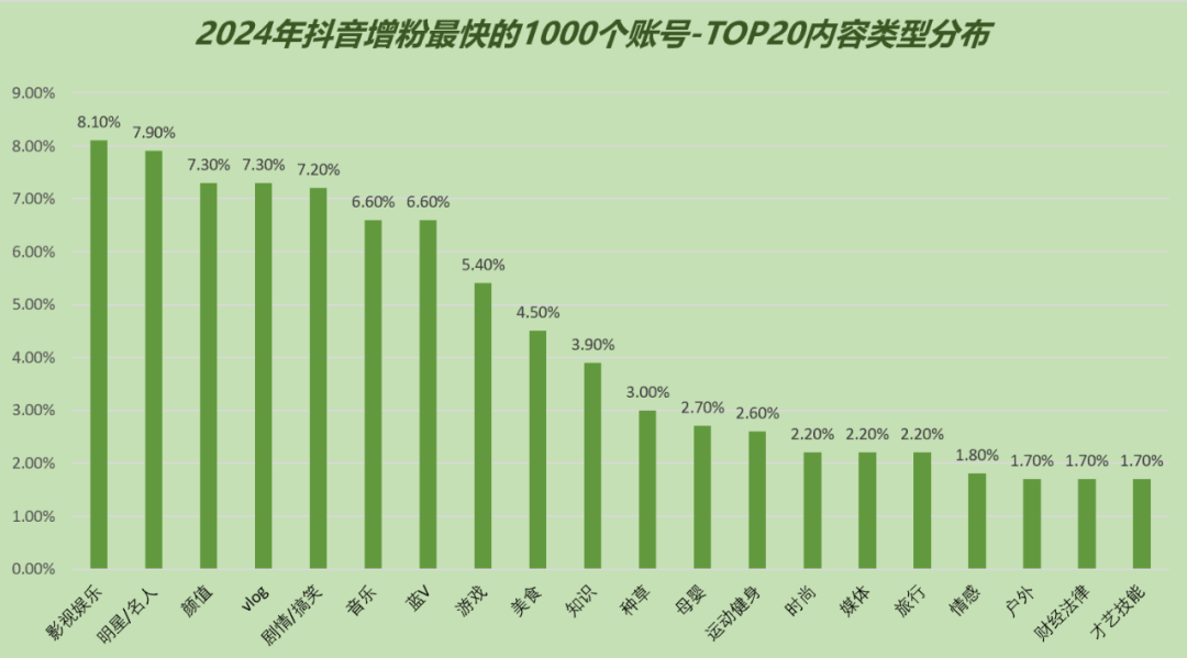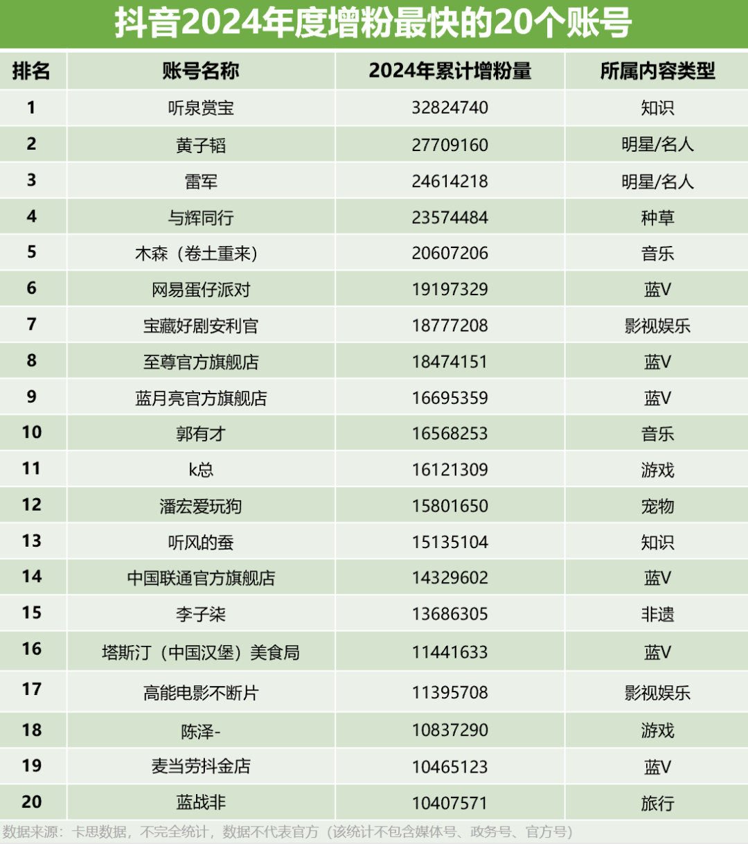 岁末年初,又到了一年一度的盘点之际。和往年一样,卡思数据依然统计出了2024年一整年抖音上涨粉数最多的1000个账号,并从数据维度、内容维度同时出发,带领大家一起深度复盘过去一年抖音内容生态的整体走势,并从中提炼出那些值得关注的潜力赛道、创作趋势、不容忽视的创作机会等,以期能为相关从业者带来一定的参考和启发。我们一起来看:(注:以下数据来源为卡思数据,不代表官方)