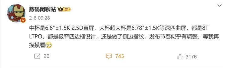 在2025年上半年最受消费者期待的新手机是什么,那可能是华为Pura 80。在春节结束后,关于Pura 80消息开始多起来,有博主爆料超大杯会搭载6.78"±1.5K等深四曲屏,主摄采用国产1英寸传感器,长焦也有望落地超大底方案。