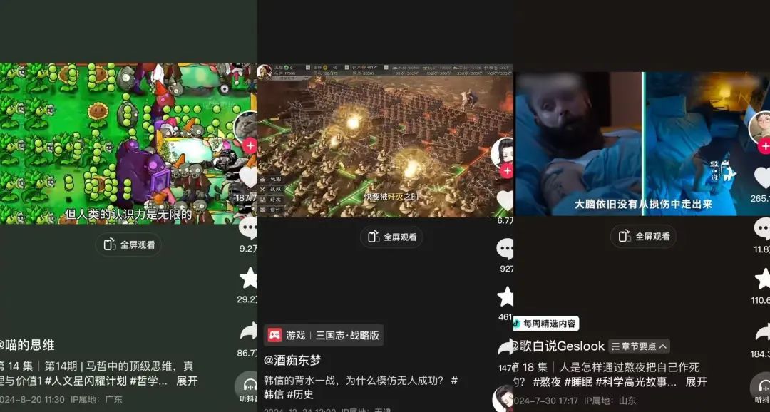 文学领域之外,@喵的思维 以植物大战僵尸来讲解哲学知识、产出了多条深度解析视频,唤起了不少用户对于哲学的兴趣;@歌白说 Geslook 则通过长视频为用户详解了众多与日常生活息息相关的议题如睡眠的原理、熬夜的伤害、如何无痛戒烟等,同样引起了用户的注意;此外,聚焦于地理知识的@星球研究所 和聚焦于历史知识的@酒痴东梦 均凭借专业而又全面的深度解析内容收获了不少关注。