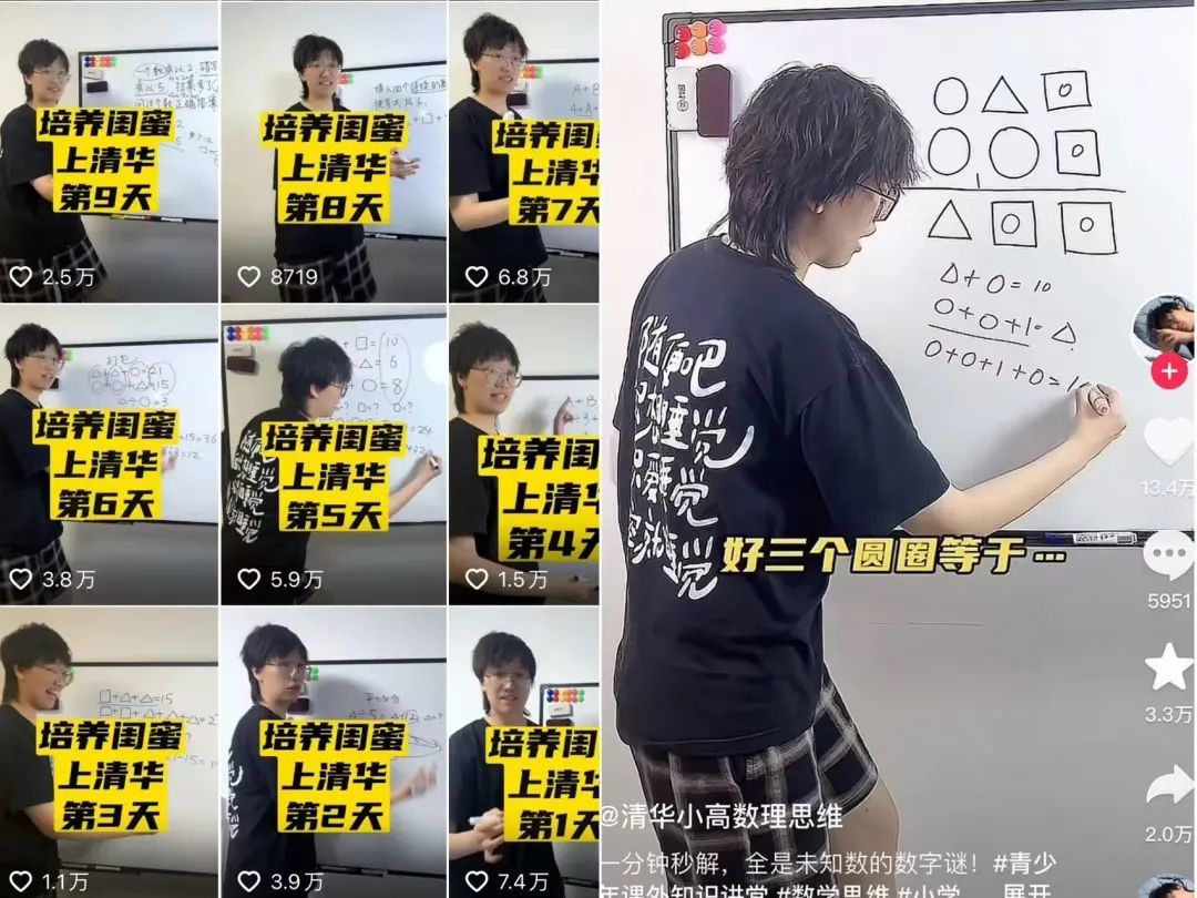 从第一条视频开始,该账号就为自己设置了“培养闺蜜上清华的第X天”的目标,然后基于这个目标天天为闺蜜讲题,在引导互动中,一道道题目的解题思路便跃然于白板之上,一目了然。