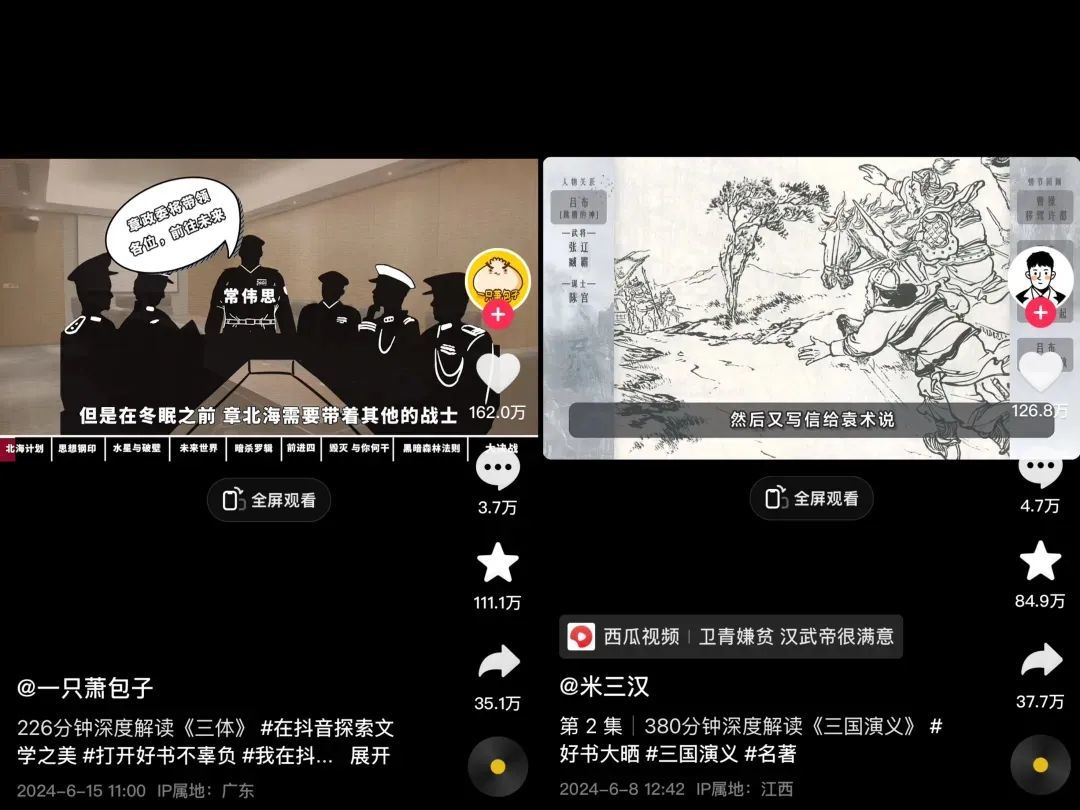 比如,去年中旬,@米三汉 用一条时长450分钟的超长视频,为用户抽丝剥茧地细致剖析了经典名著《红楼梦》,视频共获赞近1300万点赞,总播放时长达到5.6亿分钟。在发布这条视频后,其粉丝量立即开始狂涨,后续账号又推出了一系列文学名著的超长解析视频,粉丝量继续稳定增长,2024年共涨粉 514.1W;同样聚焦于深度解析文学名著的@一只萧包子 也在2024年收获了不少用户的喜爱,年涨粉151.8W;