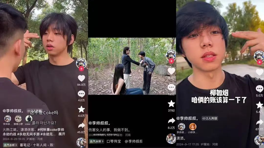 年涨粉量355.3W的@李帅叔叔,由颜值达人转型为抽象派搞笑达人,十分擅长用一本正经的表情自然而然整活,从而在反差感中不断制造笑料。比如其发布的商务短剧中,无厘头的剧情、尴尬好笑的演技、不相配的韩文翻译、破绽百出的细节,反而让视频有了一种奇特的喜剧效果;而在直播中,他也总出其不意制造笑料,一句“oi小鬼,我的时间不多了,感觉你有点火热嘛”,魔性而又洗脑,更让其不断出圈,被更多人所熟知。