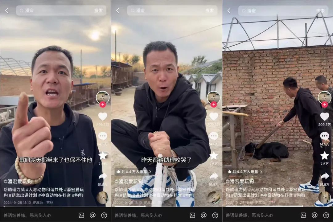 另一位则是训狗博主@潘宏爱玩狗,凭借着独特的训狗技艺和夸张亢奋的视频风格,让一众“恶狗”闻风丧胆的同时,也激起了屏幕前众多观众的兴趣。值得一提的是,因其园区的一只网红小狗“艾特”在洗澡过程中去世,带着它去洗澡的潘宏也由此陷入巨大的争议之中,账号后续情况如何,尚未可知。