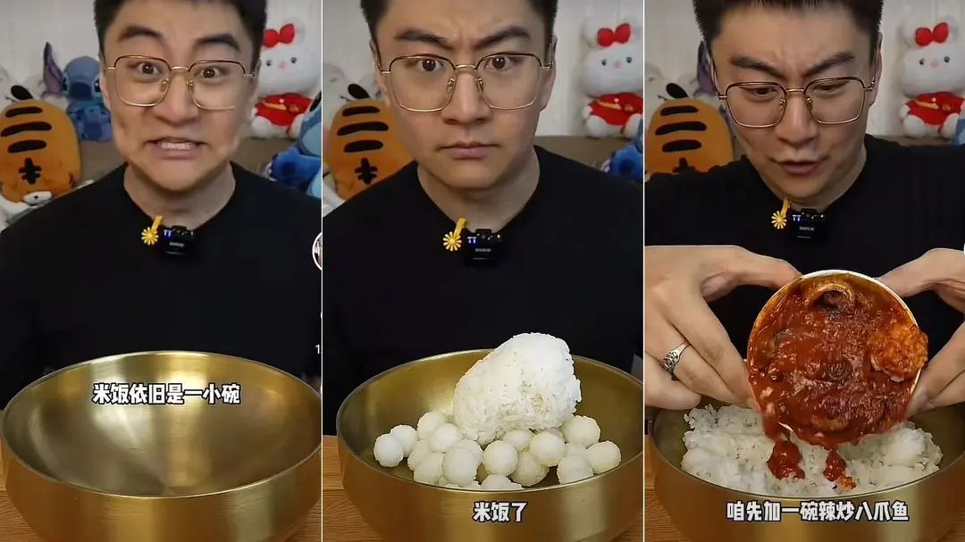 如以901.3W的年增粉量登上美食赛道涨粉TOP1的@巨爱吃的周黑鸭,不仅选择的食物非常丰富、吃东西时的表现也极具感染力,表情、动作、甚至使用的餐具都逐步形成了鲜明的个人标签,而高喊着“米饭依旧是一小碗”后使出各种手段给自己加饭的的“小心机”行为,也由此成为一个热梗,为账号又增添了一重特色。