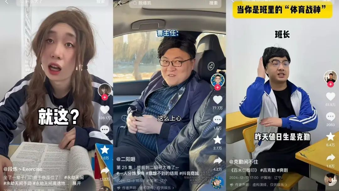 “一人分饰多角”、以戏剧性极强的形式深度还原不同生活情境如校园生活、职场生活的搞怪戏精大戏占据绝对主流,代表账号有@脱缰凯、@二阳咂、@克勤闲不住、@段炼丶Exercise、@主持人于欢 等。
