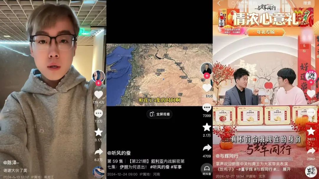 剩余账号中,董宇辉的带货“新号”@与辉同行 在2024年依然表现得“一骑绝尘”,除年度增粉2357.4W外,其直播销售额也极为可观;@听风的蚕 擅长抽丝剥茧地讲述历史、文化、军事等知识,凭借过硬的专业知识和通俗的表达引来了大批忠实观众;拥有不俗游戏实力、擅长在直播中整活的@陈泽- 于2024年转战抖音后,人气一路水涨船高;@宝藏好剧案例官 和@高能电影不断片 则都是影视娱乐账号,凭借极具噱头和吸引力的影视片段吸引了众多关注。