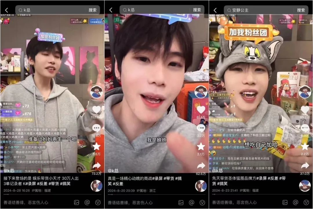 一位是打破常规带货方式的@K总,他在带货时喜欢与其他主播连麦唠嗑,并且经常灵机一动说出许多令人捧腹的带货段子,直播间抽象而松弛,笑料不断,吸引了众多网友围观;