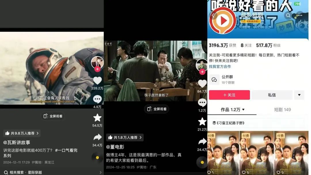 和2023年一样,2024年,影视娱乐仍然以8.1%的账号数量占比成为抖音2024年度最具优势的内容类型。 这之中,更考验创作者本人二创能力的解说型账号数量稀少,只涌现出了@瓦斯讲故事、@董电影 等凭借上乘质量吸引粉丝驻足的代表账号,其余账号基本都是电视节目的官方账号、切片式剪辑账号,以及如雨后春笋般涌现出的短剧账号——这些账号主要发布短剧精彩片段,由此引导用户付费进行观看,典型代表如年涨粉417.3W的@疏影短剧、年涨粉405.4W的@指间短剧等。