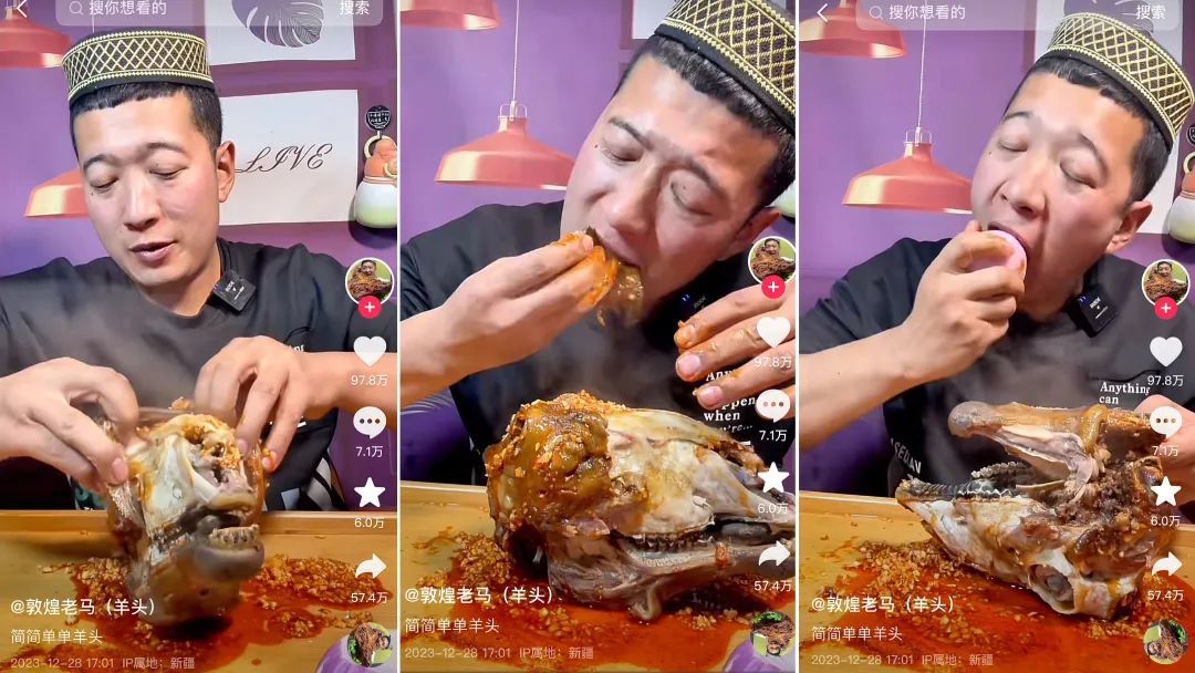 “仪式”结束、酱料被洒满羊头后,老马便会开始丝滑的进食过程,伴随着“吸溜” “吸溜”的进食声音,一只重达十几斤的羊头在3分钟内便被其暴风吸入,不少网友戏称他不是在吃羊头,而是在“喝羊头”。对羊头的热爱,加上其魔性而独特的进食流程,让他快速成为众多网友玩梗的对象,羊头终结者、互联网 “羊亡爷”等一系列称呼接踵而来,“浇给”更是成为流行语,引来大批网友玩梗,@敦煌老马(羊头)由此得以一年涨粉371.3W。