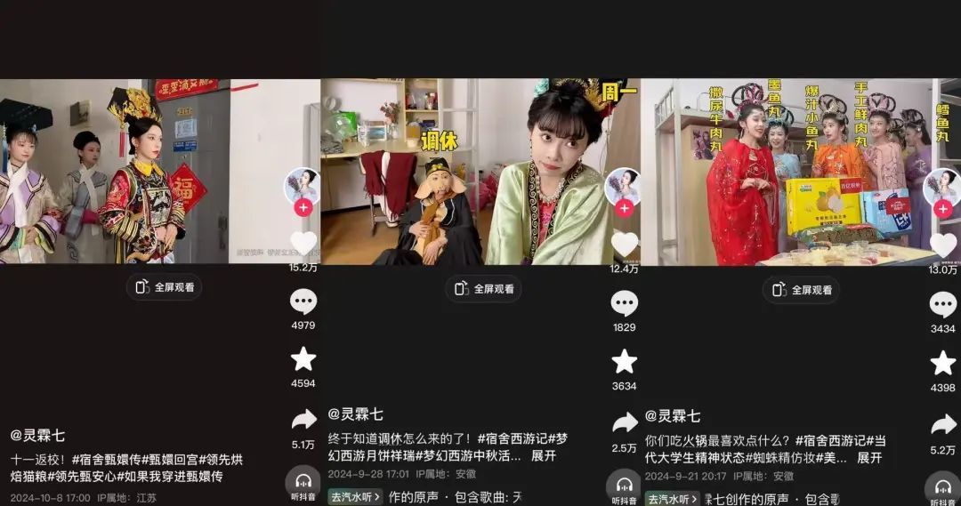 相较而言,注重场景、服化道、创意、视觉观赏性的精致派剧情账号在2024年大幅缩减,仅涌现出了@灵霖七、@李火元的赵 等少数风格化代表账号。其中,@灵霖七 是一群女大学生以宿舍为场地,翻拍、改编创作了多部经典影视作品如《西游记》《红楼梦》《甄嬛传》等。视频中,她们全员妆造精美、演技精湛,并结合现实热点对台词、剧情进行了合理的戏剧化改编,整体看起来十分引人入胜,2024年共吸粉323.9W。